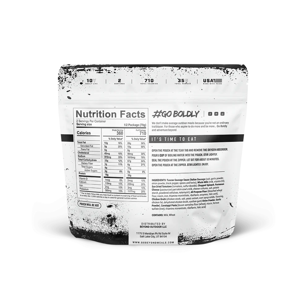 With an impressive shelf life of up to 10 years, our Tuscan Sausage Pasta is an ideal choice for camping trips, emergency preparedness, or enjoying a gourmet meal at home. Make this delicious dish a staple in your reserves, ensuring you have a satisfying and comforting option ready for any backcountry adventure or unexpected situation!